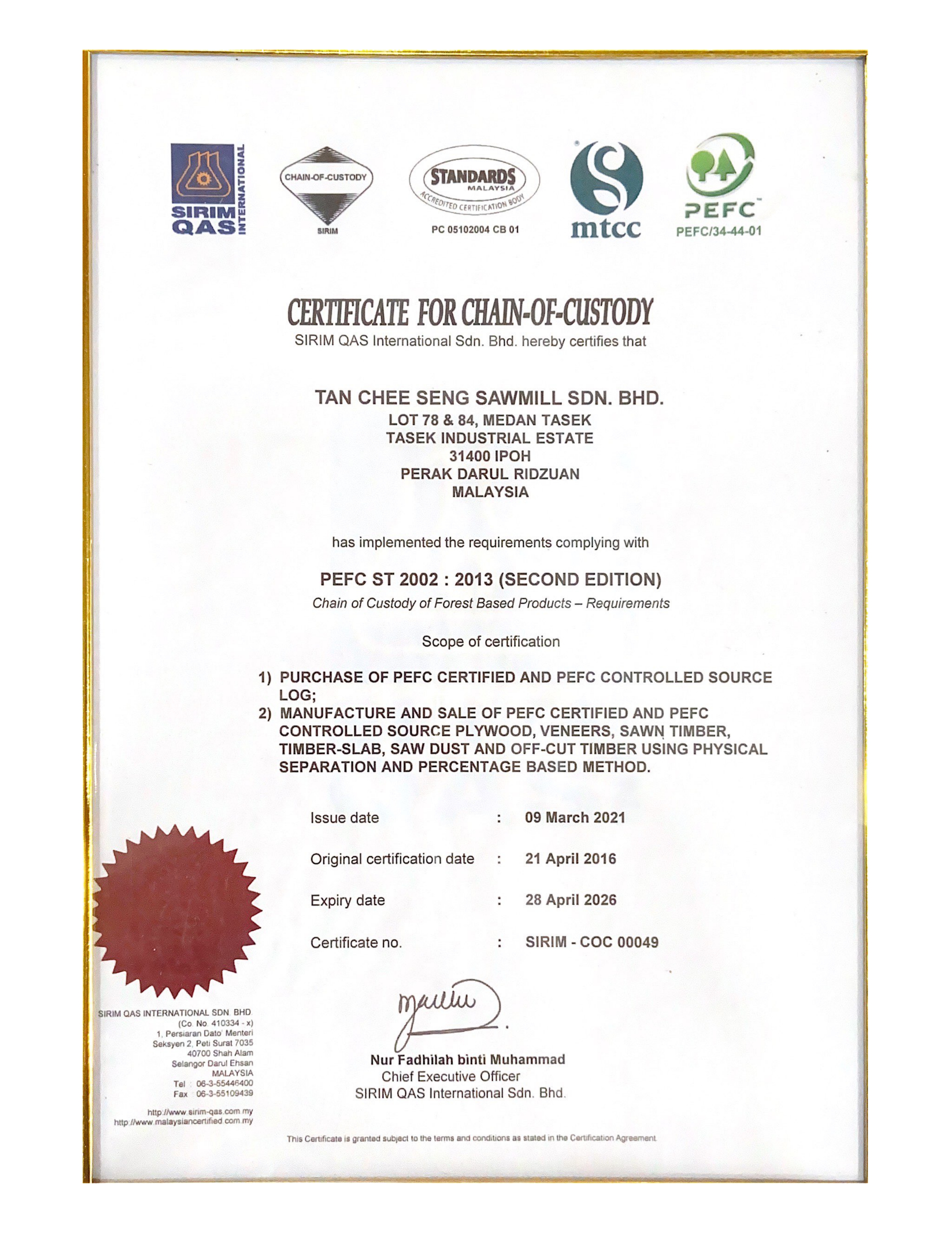 Annual audits by SIRIM QAS International Sdn. Bhd. ascertain that timber are sourced from forests which have been awarded the Certificate for Forest Management/Certificate for Forest Plantation Management.